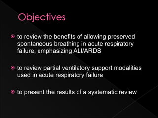 This presentation reviews the benefits of allowing preserved spontaneous breathing in acute respiratory failure. Partial ventilatory support modes like pressure support, airway pressure release ventilation (APRV), proportional assist ventilation (PAV) and neurally adjusted ventilatory assist (NAVA) allow spontaneous breathing while providing ventilatory support. A systematic review found that these modes are associated with improved hemodynamics, gas exchange and reduced medication use compared to controlled mechanical ventilation. However, the review included a variety of study designs and only two small randomized controlled trials, so definitive conclusions cannot be drawn regarding outcomes. While observational studies suggest clinical benefits, more high-quality research is still needed.