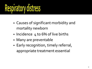 This document provides guidance on evaluating and managing respiratory distress in newborns. It discusses the main causes of respiratory distress including respiratory distress syndrome, transient tachypnea of the newborn, and meconium aspiration syndrome. The document outlines the key components of history taking and physical examination for newborns presenting with respiratory distress. It also reviews diagnostic testing including chest x-rays and blood gases. Common treatment approaches are summarized, including supportive care, surfactant therapy, and mechanical ventilation when indicated. The goal is early recognition and management to prevent morbidity and mortality in newborns with respiratory complications.