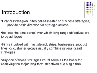 The document discusses grand strategies that provide overall direction for strategic actions of firms operating in multiple industries or business areas. It outlines four main grand strategy alternatives: stability, growth, combination, and retrenchment. Stability involves remaining the same size or growing slowly, while growth can involve internal expansion or external diversification. Combination uses different strategies for different units, and retrenchment shrinks or sells off businesses. The document also presents a grand strategy matrix based on market growth and competitive position, outlining suitable strategies for each quadrant, such as market penetration, product development, or divestiture. It further defines various strategies like forward integration, divestiture, liquidation, and conglomerate diversification.