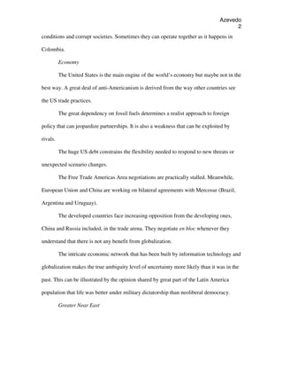 The document discusses the international security environment and proposes a grand strategy for a new US administration. It identifies key threats such as weapons proliferation, terrorism, transnational crime, and economic and geopolitical challenges. It argues that while no threats currently jeopardize US supremacy, failing to address issues could undermine it long-term. The document proposes adopting a cooperative security strategy to deal flexibly with state and non-state actors in an interconnected world. This strategy would entail sharing burdens with partners through investment rather than military intervention alone. Transitioning to this strategy would require compromise but pay dividends over the long-run.