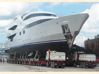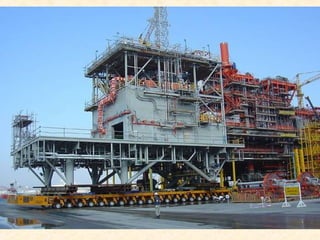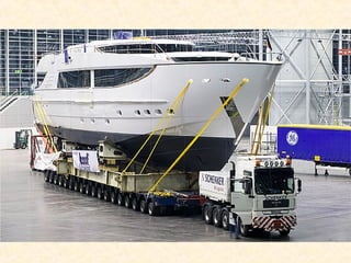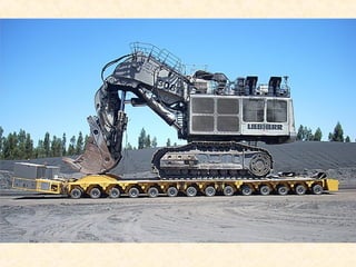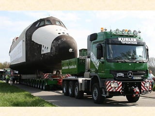 This document discusses a large vehicle used to transport heavy loads. It has a loading platform with many wheels, living quarters with three stories, and a powerful marine diesel engine. The vehicle needs to carefully navigate tricky corners and its front and rear steering wheels turn in opposite directions. Seeing one of these large vehicles is a rare occurrence that is a big deal when it happens.