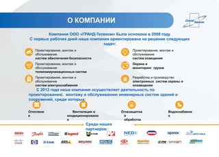 Компания ООО «Гранд-Телеком» основана в 2008 году и занимается проектированием, монтажом и обслуживанием инженерных систем зданий и сооружений, включая системы безопасности, телекоммуникации, отопление и вентиляцию. Она имеет более 50 сотрудников, реализовала свыше 20 проектов и пользуется современным оборудованием от мировых производителей. Компания обеспечивает высокое качество услуг и предоставляет долгосрочную гарантию на выполненные работы.