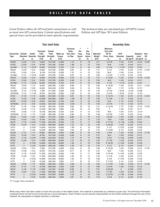 The document provides technical data and specifications for drill pipe assemblies, including dimensions, material properties, and performance metrics for the pipe body, tool joints, and complete drill pipe strings. Tables list measurements and ratings for different pipe sizes, materials, and configurations. The document aims to support reference and selection of drill pipe options but notes that accuracy cannot be guaranteed and no warranties are made regarding results from using the data.
