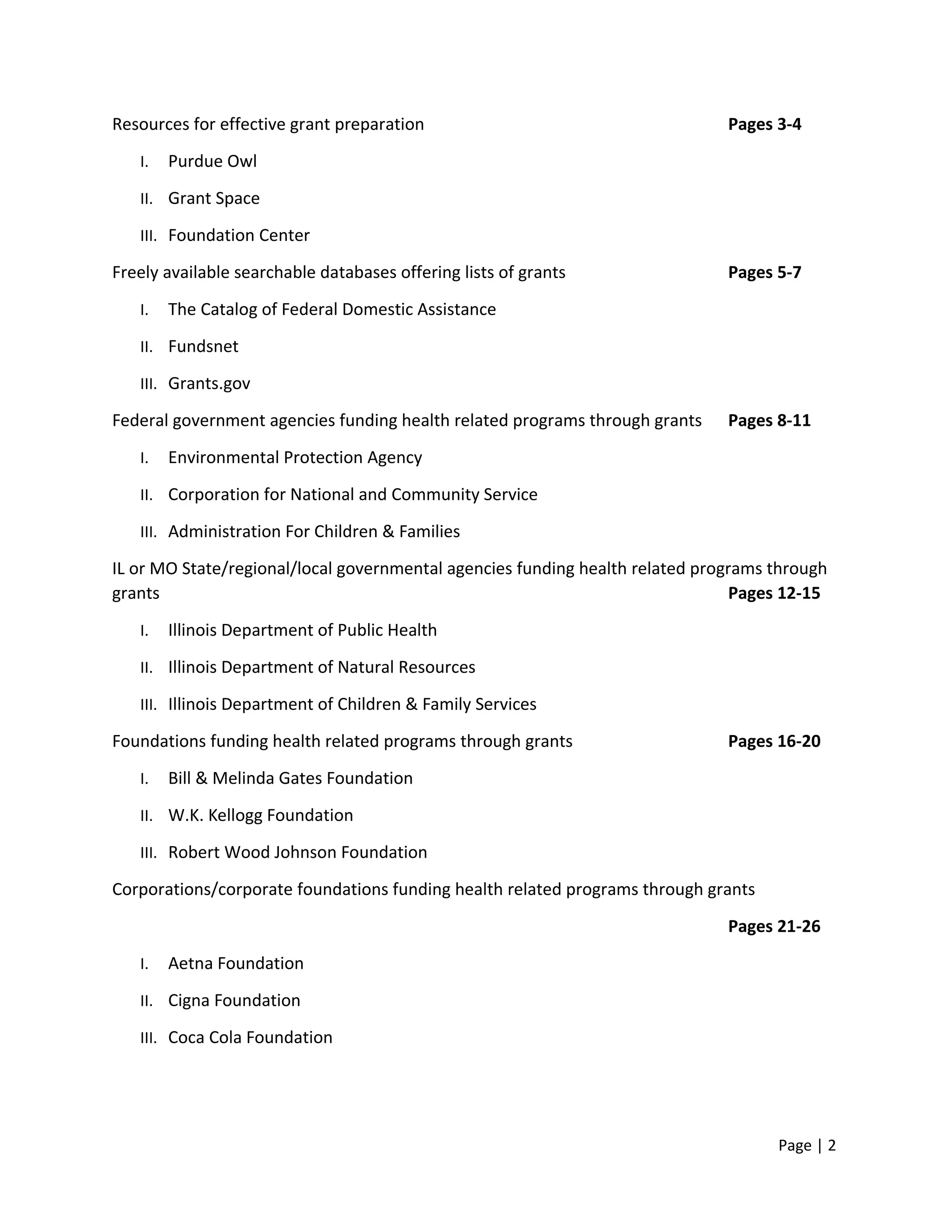 The document provides information on various resources for grant writing including Purdue Owl, Grant Space and Foundation Center. It also lists searchable databases for grants such as Catalog of Federal Domestic Assistance, Fundsnet and Grants.gov. Federal agencies that fund health programs through grants include the Environmental Protection Agency, Corporation for National and Community Service and Administration for Children and Families. State agencies in Illinois that provide health-related grants are the Department of Public Health, Department of Natural Resources and Department of Children and Family Services. Foundations like the Bill & Melinda Gates Foundation, W.K. Kellogg Foundation and Robert Wood Johnson Foundation offer health-related grants.