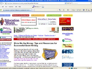 The document provides tips and resources for writing successful grant proposals. It outlines the key elements to include: having a clear project idea and plan, obtaining permission, researching potential funding sources, and addressing the typical sections of a proposal such as the application forms, narrative, and budget. Numbers and data are emphasized to demonstrate need, goals, and evaluation methods. Following funder guidelines exactly and learning about their priorities are advised to improve chances of being funded.