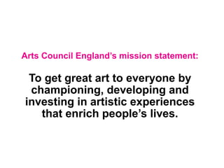 This document provides information about Arts Council England's Grants for the Arts Libraries Fund. The £6 million fund is exclusively for projects led by public libraries in partnership with arts organizations. It aims to stimulate innovative partnerships between libraries and artists/arts groups and encourage community participation in arts activities. Libraries can apply for funding to support a wide range of arts projects and events in their communities. The assessment criteria focus on the quality of the artistic experience, public engagement, project management, and financial feasibility. Support is available to help libraries develop ambitious applications that deliver high-quality arts experiences.