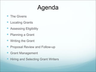 The document provides an overview of the grant writing process, beginning with locating potential grants, assessing eligibility, planning proposals, writing effective applications, budgeting, evaluation, submission, and post-award management. Key steps include understanding the funder's priorities and guidelines, establishing measurable goals and objectives, developing a timeline and budget, and planning ongoing evaluation methods. Effective grant writing requires thorough preparation, understanding the funder's requirements, and demonstrating organizational capacity.