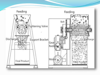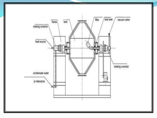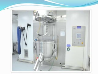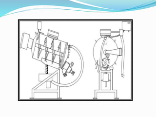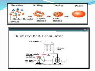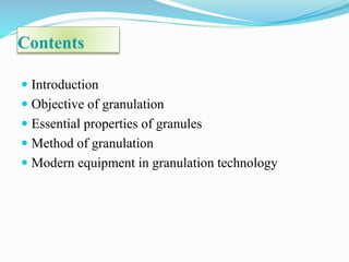 The document discusses granulation, a process used in the pharmaceutical industry to form grain-like agglomerates from powdered particles, facilitating the production of solid dosage forms. It outlines the objectives, essential properties, various methods of granulation, and modern equipment utilized for the granulation process. Equipment mentioned includes oscillating granulators, high shear granulators, fluidized bed granulators, and others, all designed to enhance the quality and efficiency of granules for pharmaceutical applications.