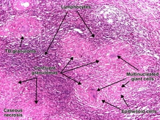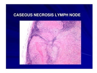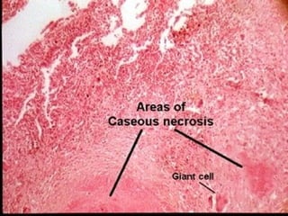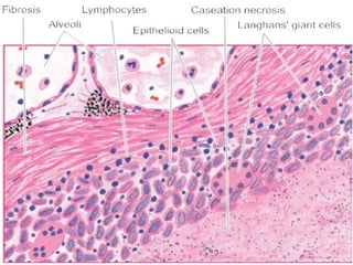 Granuloma is defined as a localized collection of modified macrophages called epithelioid cells surrounded by lymphocytes. It forms as an immune response to foreign substances that cannot be easily eliminated by the body. A granuloma contains epithelioid cells, multinucleated giant cells formed by the fusion of macrophages, and a rim of lymphocytes, and may develop central caseous necrosis. Tuberculosis causes immune granulomas known as tubercles, which typically feature caseating necrosis. Granulomas aim to wall off pathogens and prevent their spread in the body.