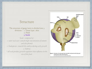 The document discusses the structure and composition of grape seeds, highlighting that grape seed extract is rich in proanthocyanidins, which have significant antioxidant properties. It also compares the antioxidant activity of grape seed extract with that of fruits such as tomatoes and bananas, demonstrating that grape seed extract is more potent. Various extraction and analysis methods are outlined, as well as the benefits and potential side effects of grape seed oil and extract.