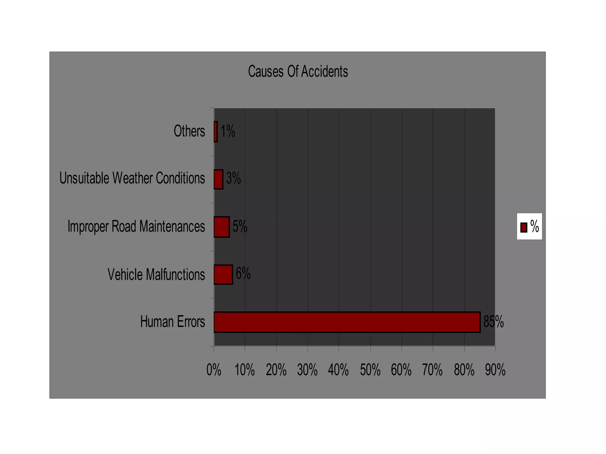 1) 85% of accidents are caused by human error such as speeding, distractions, or improper maneuvers.