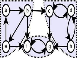 A graph is a data structure consisting of nodes connected by edges. There are different types of graphs such as undirected graphs, directed graphs, connected graphs, and strongly connected graphs. Algorithms like depth-first search, Kosaraju's algorithm, and Warshall's algorithm can be used to find strongly connected components, biconnected components, and shortest paths in graphs.