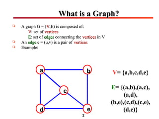 This document defines key graph terminology and concepts. It begins by defining what a graph is composed of - vertices and edges. It then discusses directed vs undirected graphs and defines common graph terms like adjacent vertices, paths, cycles, and more. The document also covers different ways to represent graphs, such as adjacency matrices and adjacency lists. Finally, it briefly introduces common graph search methods like breadth-first search and depth-first search.