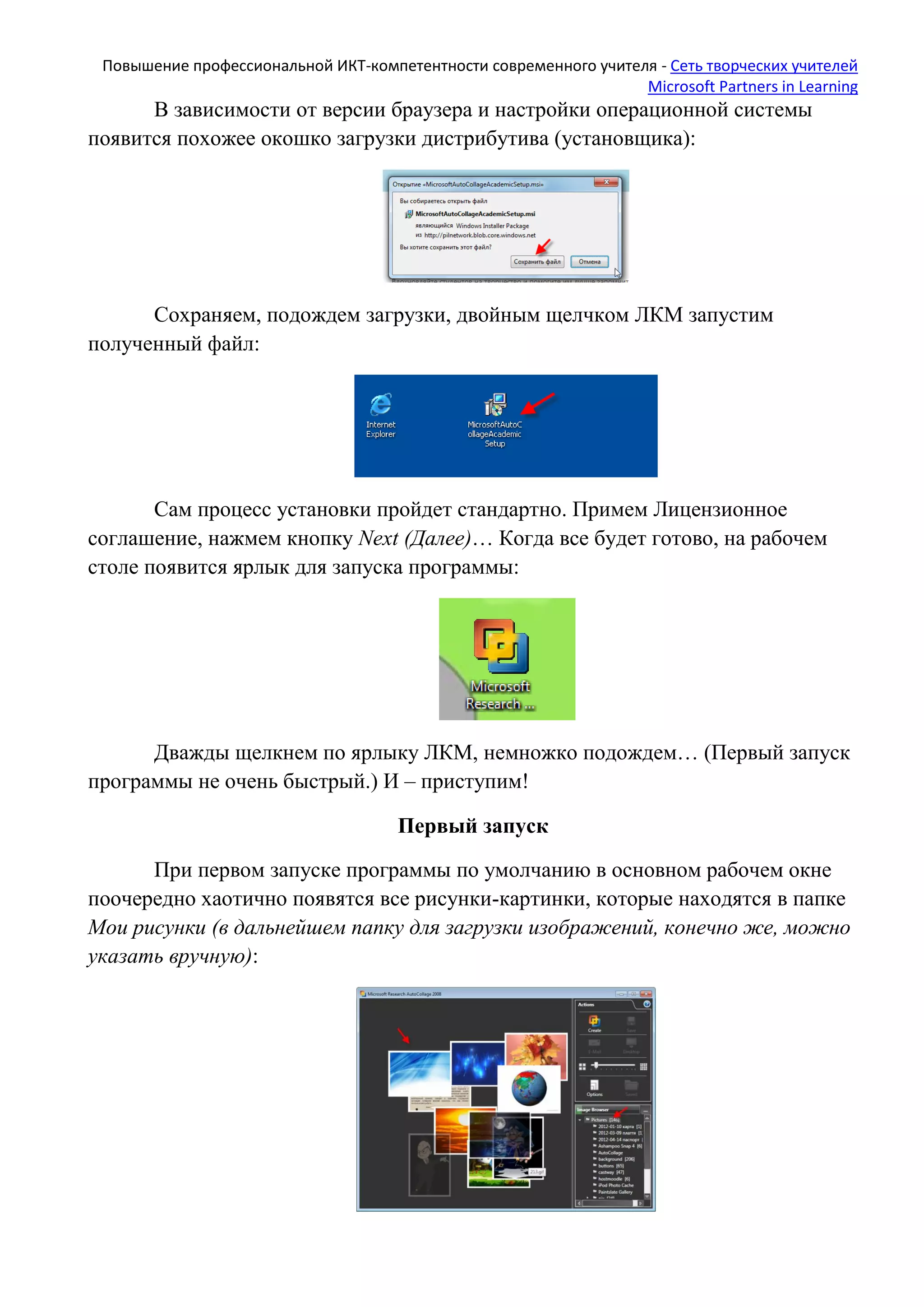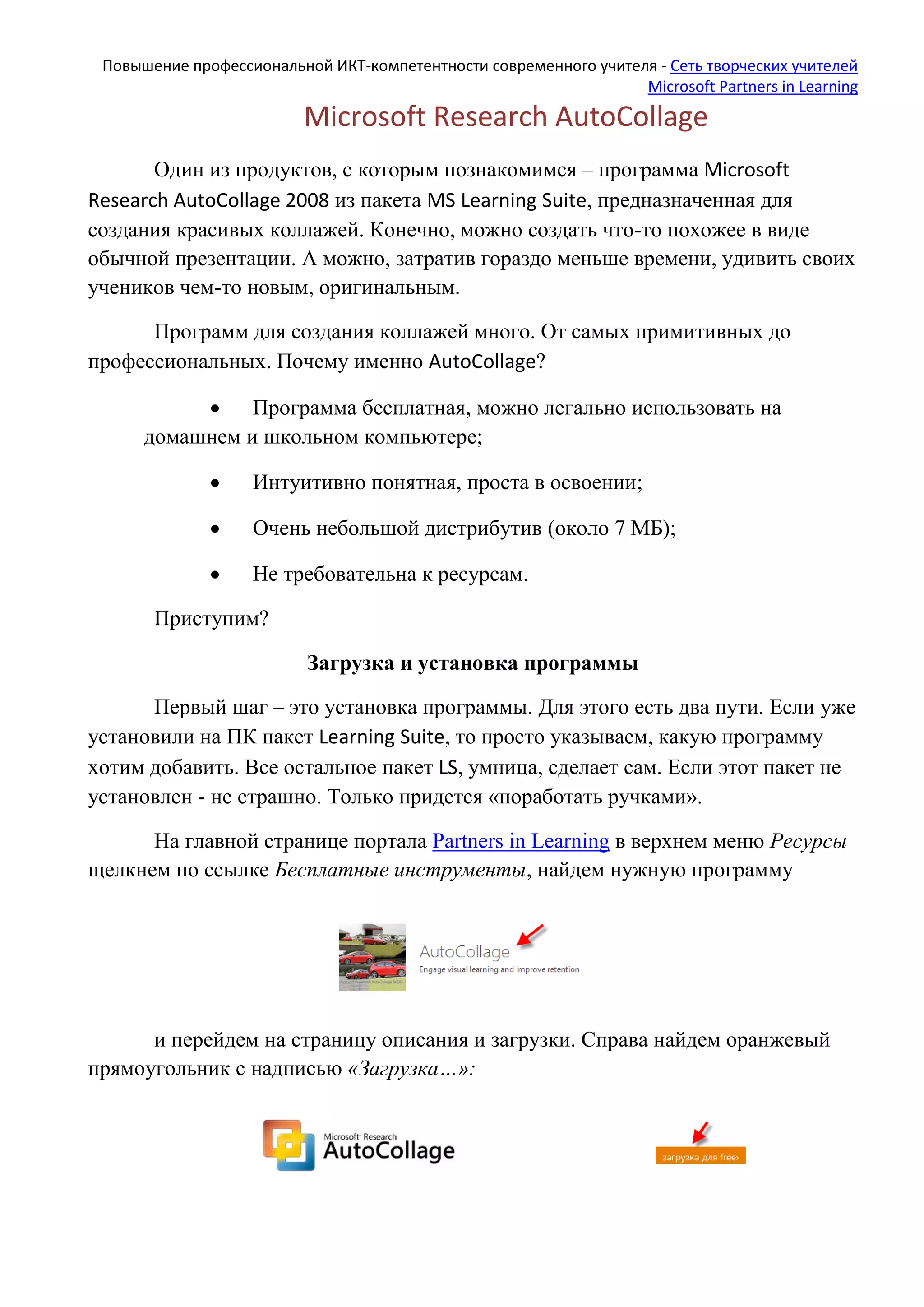 Документ описывает программу Microsoft Research Autocollage 2008, предназначенную для создания коллажей, и акцентирует внимание на ее простоте и бесплатности использования. Указывается, как установить программу, настраивать параметры создания коллажей и возможности для использования в образовательных целях. В завершение представлены идеи для практического применения Autocollage в учительской деятельности.