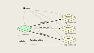 The document compares relational and graph databases, noting that relational databases require more joins when querying normalized data which increases query time. Graph databases provide an alternative by storing data in nodes and edges, allowing for faster index-free adjacency queries. Neo4j is highlighted as an example of a graph database that is fully ACID compliant and uses the Cypher query language.