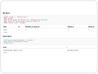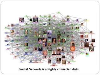 The document discusses a project analyzing social networks using a graph database. It introduces the three project members and defines what a graph is - a collection of nodes and relationships. It then discusses properties of graph databases, why the Neo4j graph database was chosen, its Cypher query language, and compares graph and relational databases. Execution times are faster for graph databases on large connected datasets. Applications discussed include product recommendation and finding shortest paths.