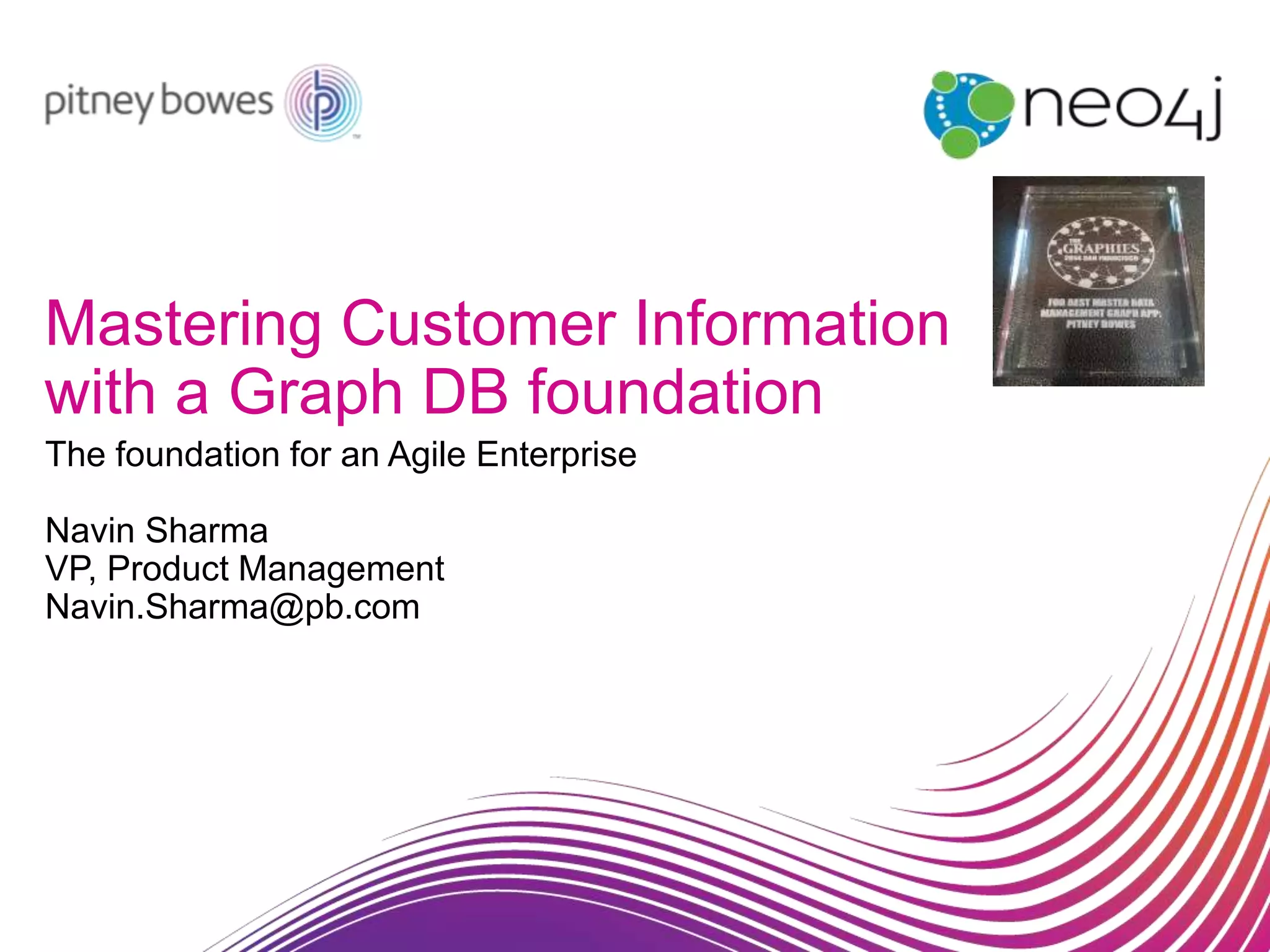 The document discusses using a graph database foundation for customer information management. It outlines how traditional approaches using rigid SQL databases lack agility and require long implementation cycles. A graph database like Neo4j allows for a more flexible data model that can be visually modeled to the business and provide multi-dimensional, contextual views of customer data. It also discusses how the graph database can integrate diverse data sources, apply data quality processes, and provide insights through querying and visualization of the knowledge graph.