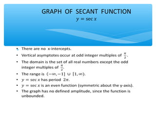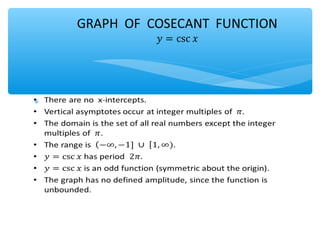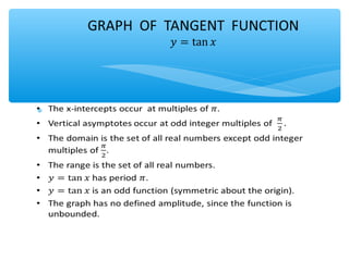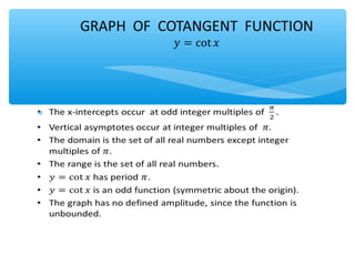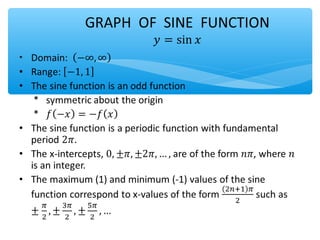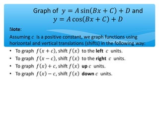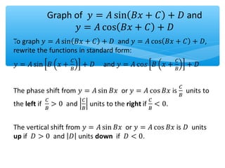 The document outlines learning objectives for a lesson on trigonometric functions. Students will develop properties of trig functions, learn to find the amplitude, period, phase shift and vertical shift from equations, and graph trig functions. They will analyze sinusoidal graphs and their amplitude and period through examples.
