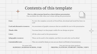 This document contains a template for a presentation with sections for purpose, hypotheses, objectives, methodology, analysis, and conclusions. It includes placeholder text and graphics that can be replaced. Instructions are provided on modifying text, replacing images, and using alternative graphic resources included in the template. Credits to the template designer must be included if using the free version.