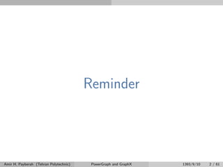 The document discusses PowerGraph, a graph processing system that uses a vertex-cut partitioning approach to distribute graphs across machines more efficiently than edge-cut partitioning. PowerGraph uses a Gather-Apply-Scatter (GAS) programming model and can execute asynchronously or synchronously in bulk synchronous parallel fashion. It employs techniques like delta caching to optimize performance on iterative algorithms by caching accumulated values from previous iterations.