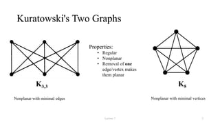The document discusses planarity and dual graphs, focusing on Kuratowski's two graphs and properties of nonplanar graphs that become planar upon the removal of edges or vertices. It outlines a formal method for checking graph planarity and defines key concepts such as dual graphs, thickness, crossing number, and self-dual graphs. Additionally, it highlights the relationships between graph properties and conditions for planarity.