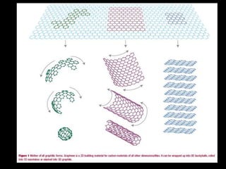 Graphene is a single-atom thick layer of carbon that was discovered in 2004. It has unique electrical, mechanical, and optical properties including high electron mobility, strength stronger than diamond but flexible like rubber, and ability to transmit light. These properties make it promising for applications in electronics, composites, energy storage, and more. Graphene is still in early stages of research and development.