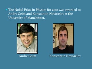 The document summarizes the properties and potential applications of graphene. Graphene is a one-atom thick sheet of carbon atoms arranged in a honeycomb lattice. It is the strongest material known, more conductive than silver, and highly transparent. Researchers at the University of Manchester were awarded the Nobel Prize for first isolating graphene sheets. Graphene's unique properties make it promising for applications like faster electronics, stronger and lighter composite materials, better solar cells and displays. However, challenges remain in controlling its conductivity for transistors.