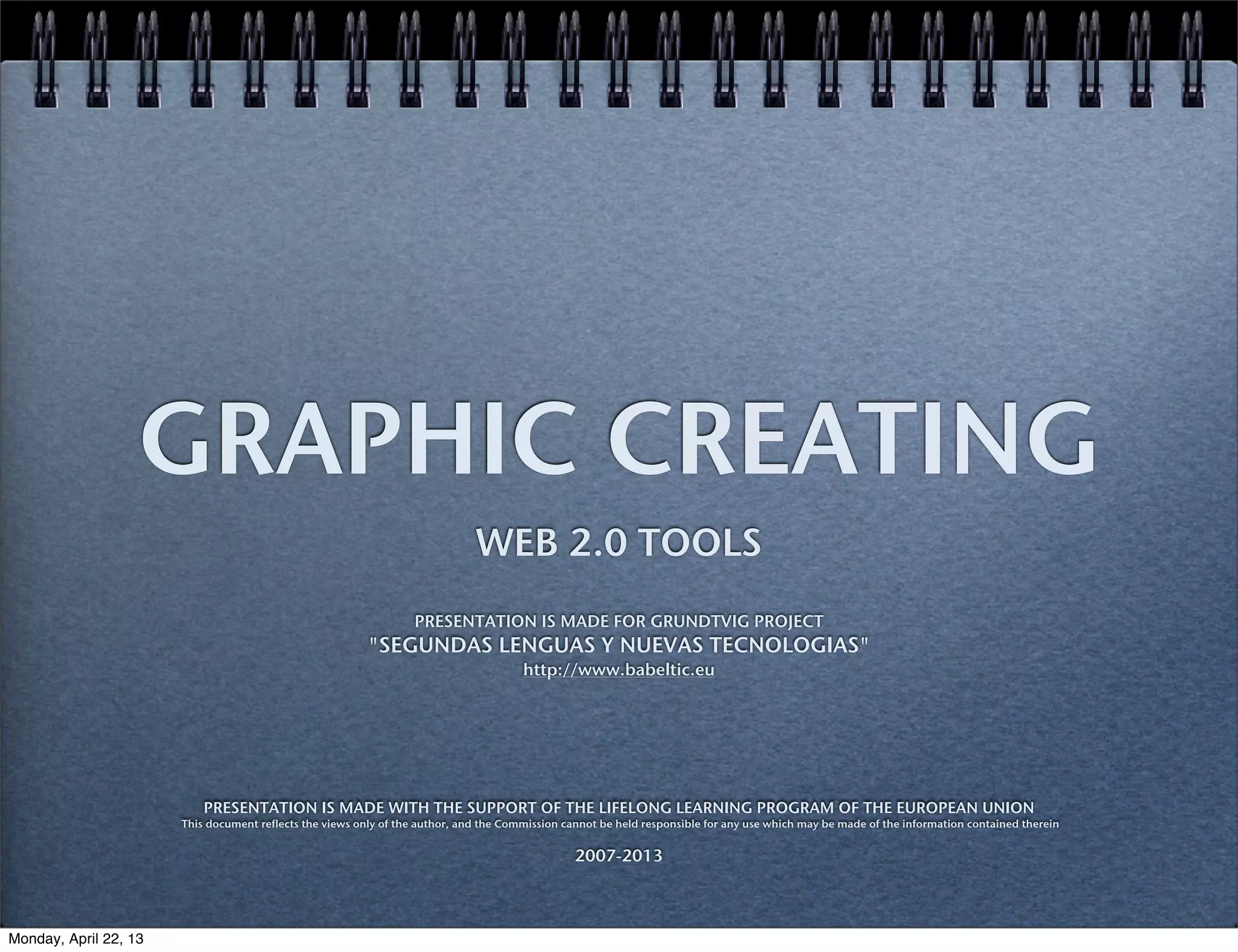 This document presents a presentation about graphic creating web 2.0 tools made for a Grundtvig project on second languages and new technologies. It lists several online tools for creating word clouds, tag clouds, sketches, maps, logos, fonts, animations, and avatars. The presentation was created with support from the Lifelong Learning Program of the European Union and reflects only the author's views.