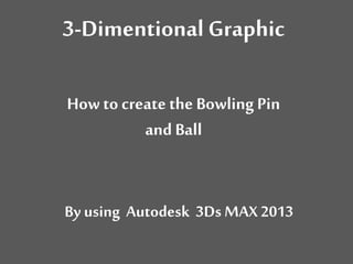 The document provides instructions for creating a 3D bowling pin and ball using Autodesk 3Ds MAX 2013. It first defines what 3D computer graphics are. It then explains that it will use a real bowling pin as reference to draw half its outline with lines, and smooth the vertices to curve the lines. The bottom curve is then changed to a line. A lathe modifier is added to create the pin shape. Finally, it states it will make a bowling ball by selecting a sphere primitive.