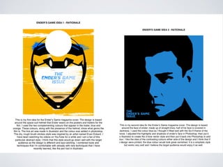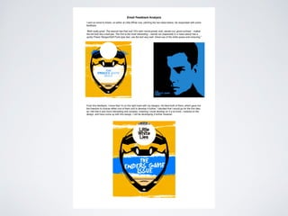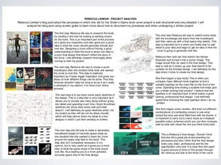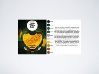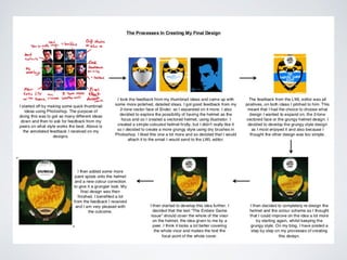The document outlines Ryan Worcester's graphic design work for a Little White Lies magazine cover project and Snake Escape app and game. It includes schedules and goals for the projects, research on cover and app icon designs, draft designs, and feedback received. Draft designs included app icons, t-shirts, stickers, and a poster. Feedback led to changes like adding color, unifying design elements, and showing gameplay. The final assets included refined app icon, t-shirt with icon, sticker set with linked designs, and a poster with QR code and screenshots. Additional work analyzed video game box covers and included original box art.