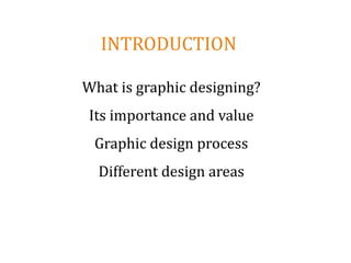 The document is an introduction to graphic design, outlining its definition, importance, and the design process. It emphasizes that graphic design is about communication, involving concepts like color theory and typography, rather than just technical skills. The presentation also covers various design areas, including web, graphic, UI, and multimedia design, while advocating for the central role of design in driving innovation and brand loyalty.