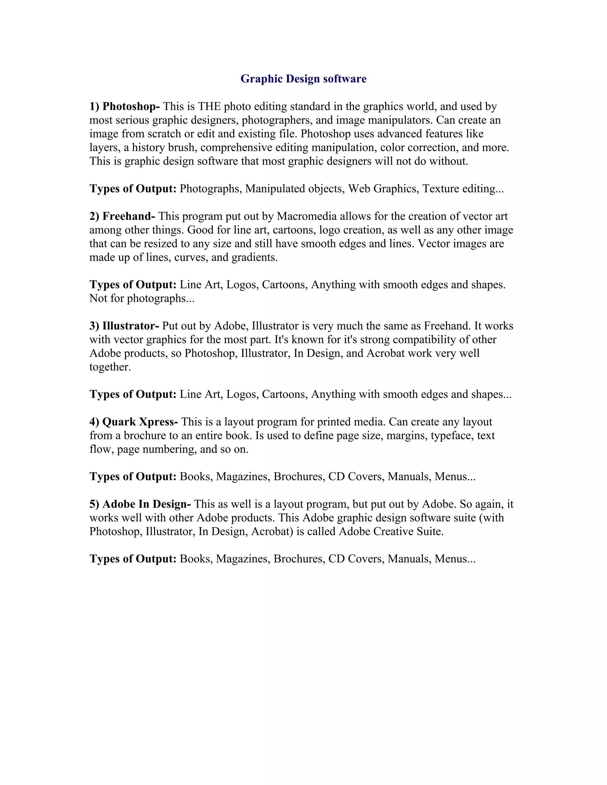 The document provides an overview of various graphic design software including Photoshop, Freehand, Illustrator, Quark Xpress, and Adobe InDesign, highlighting their primary functions and types of output. Photoshop is a leading photo editing tool, Freehand and Illustrator focus on vector graphics, while Quark Xpress and InDesign are layout programs for printed media. The Adobe Creative Suite integrates these tools for enhanced compatibility and functionality in graphic design projects.