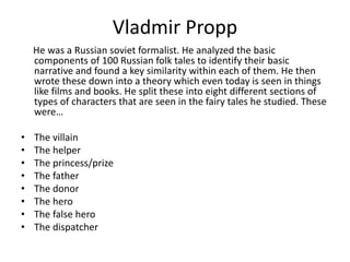Vladimir Propp analyzed 100 Russian folk tales and identified common narrative components, which he organized into a theory. He identified 8 character types that frequently appear: the villain, helper, princess/prize, father, donor, hero, false hero, and dispatcher. Propp's analysis found that tales share a common structure involving an equilibrium that is disrupted, a hero's journey to restore equilibrium, and a new conclusion/equilibrium. His work established structuralism in folklore and narrative studies.