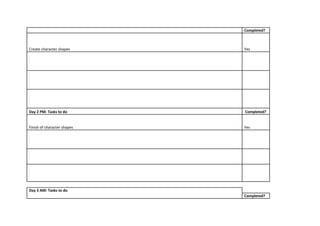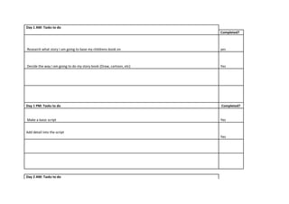 The document outlines a week-long schedule for completing a children's book, including tasks such as researching the story, creating character shapes and backgrounds, adding narration to pictures, and filling in an evaluation. Each day is divided into morning and afternoon tasks, with checkboxes to mark tasks as completed.