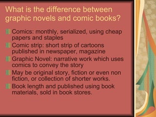 Graphic novels differ from comic books in that they are longer narrative works bound like books rather than monthly serialized issues. While comics were originally for entertainment, graphic novels address more serious topics for adult audiences. A key early graphic novel was 1978's 'A Contract with God' which helped establish the format as a serious literary medium, like 1986's 'Maus' which won a Pulitzer Prize.