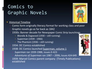 The document provides a historical timeline and overview of comics and graphic novels from their origins in the 19th century to modern formats and genres. It discusses key developments such as the emergence of graphic novels in the 1970s with works like Maus and A Contract with God. Popular comic characters and franchises are noted from the 1930s-2000s. The types of creative roles in comics production and various comic/graphic novel formats are defined. Censorship issues, gender representations, and collecting criteria for libraries are also covered.