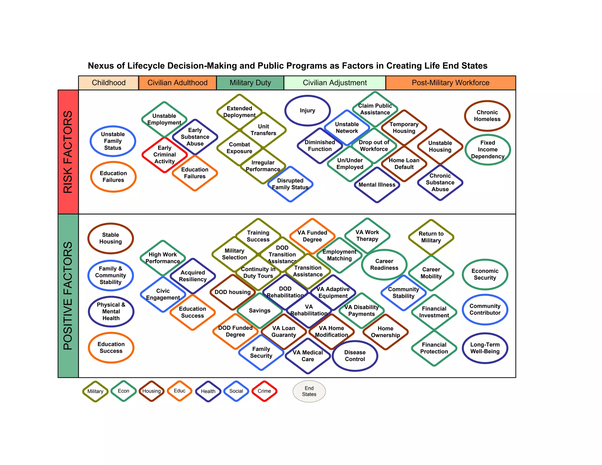 This document outlines various risk factors and positive factors across a person's lifecycle that could influence outcomes such as chronic homelessness, stable employment and housing, or other "life end states". The risk factors include things like early substance abuse, unstable housing and employment, mental illness, while positive factors encompass military training success, VA and DOD benefits, education, continuity in military duty, and financial stability. The document suggests examining how these different factors interact across childhood, civilian/military adulthood, and post-military civilian adjustment to understand their impact on public assistance dependency or successful community integration.