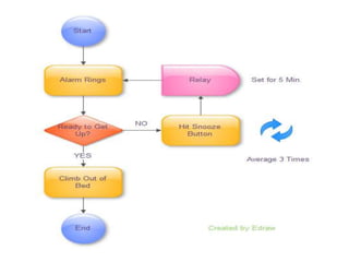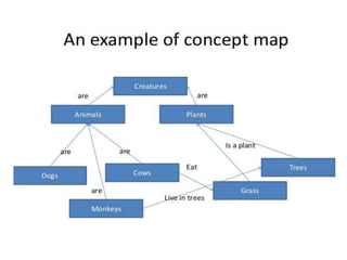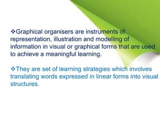 The document discusses different types of graphical organizers that can be used to structure and represent information visually, including concept maps, mind maps, and flowcharts. It provides details on their origins, components, uses, and guidelines for creating each type. Graphical organizers translate words into visual structures to achieve meaningful learning. Common types include cyclic, hierarchical, sequential, and conceptual organizers. Concept maps specifically show relationships between concepts using boxes and arrows, while mind maps radiate from a central topic. Flowcharts depict processes and workflows using standard symbols like boxes, arrows, and diamonds.
