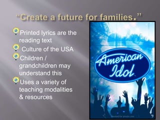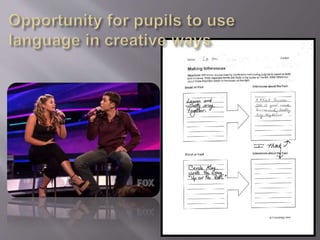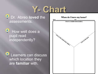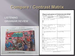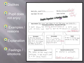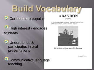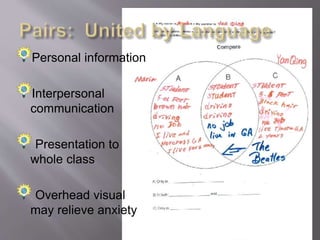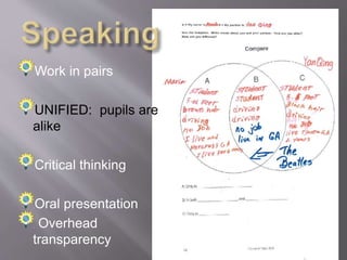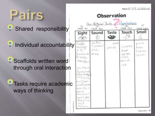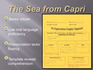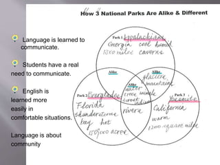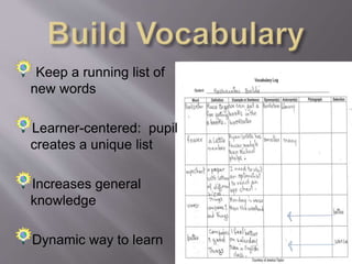 This document discusses strategies for teaching English as a second language. It recommends using multiple modalities like visual and spatial aids to help students better learn and internalize new information. Some key strategies include using modified texts and real-world vocabulary to build comprehension, incorporating listening, speaking, reading and writing activities, and creating a positive learning environment where students can apply what they're learning. Formative assessments are encouraged to track student progress towards goals.