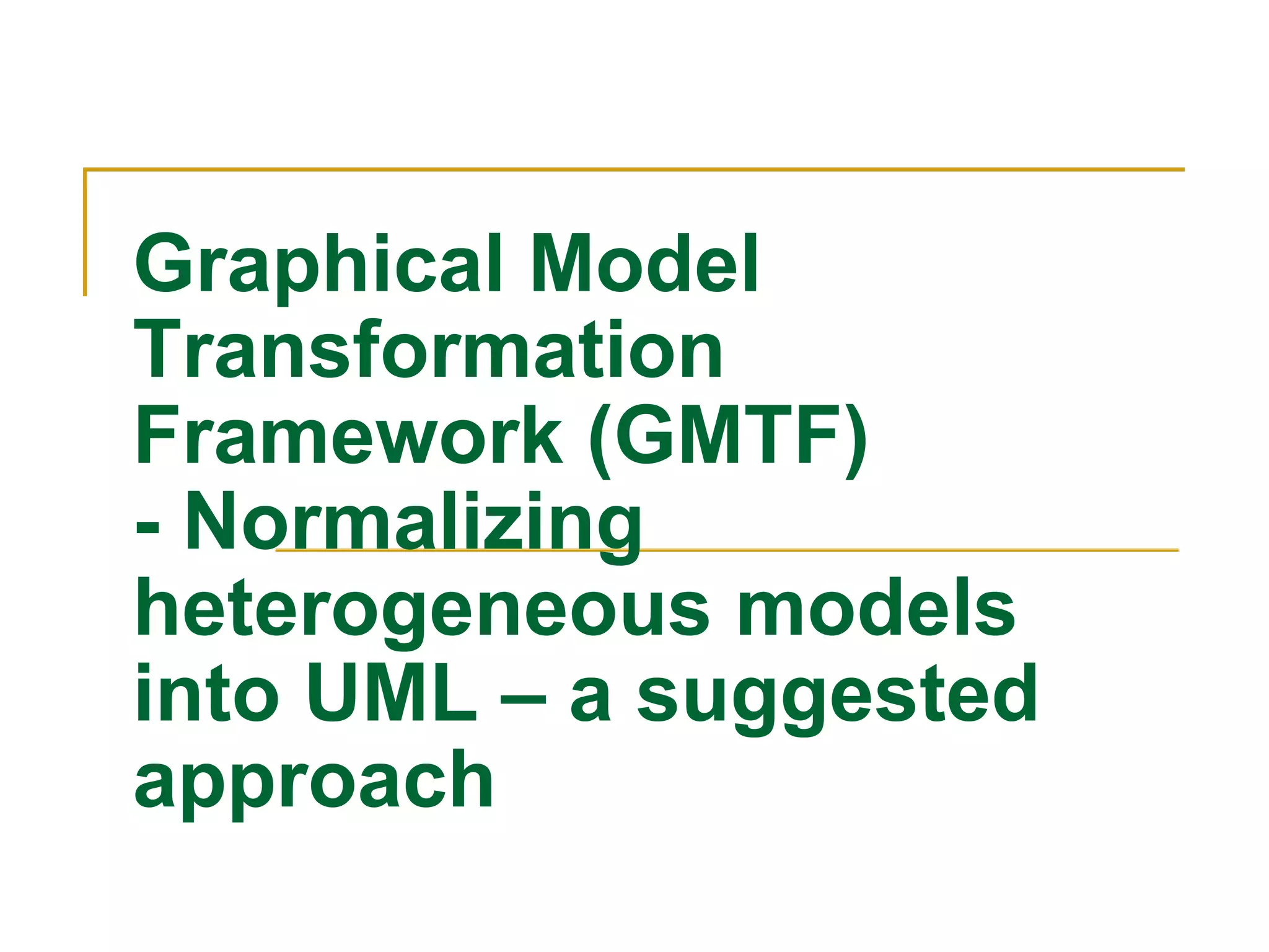 The document proposes a graphical model transformation framework (GMTF) to normalize heterogeneous domain models into a standard UML format. The framework involves first capturing business requirements in a computation independent model (CIM) using various specifications. The CIM is then converted into a platform independent model (PIM) using EMF. Finally, the PIM is translated into one or more platform-specific models (PSMs) using tools like Eclipse. Case studies demonstrate converting models from WSDL, Java code, and database schemas into UML-based PSMs using the GMTF approach.