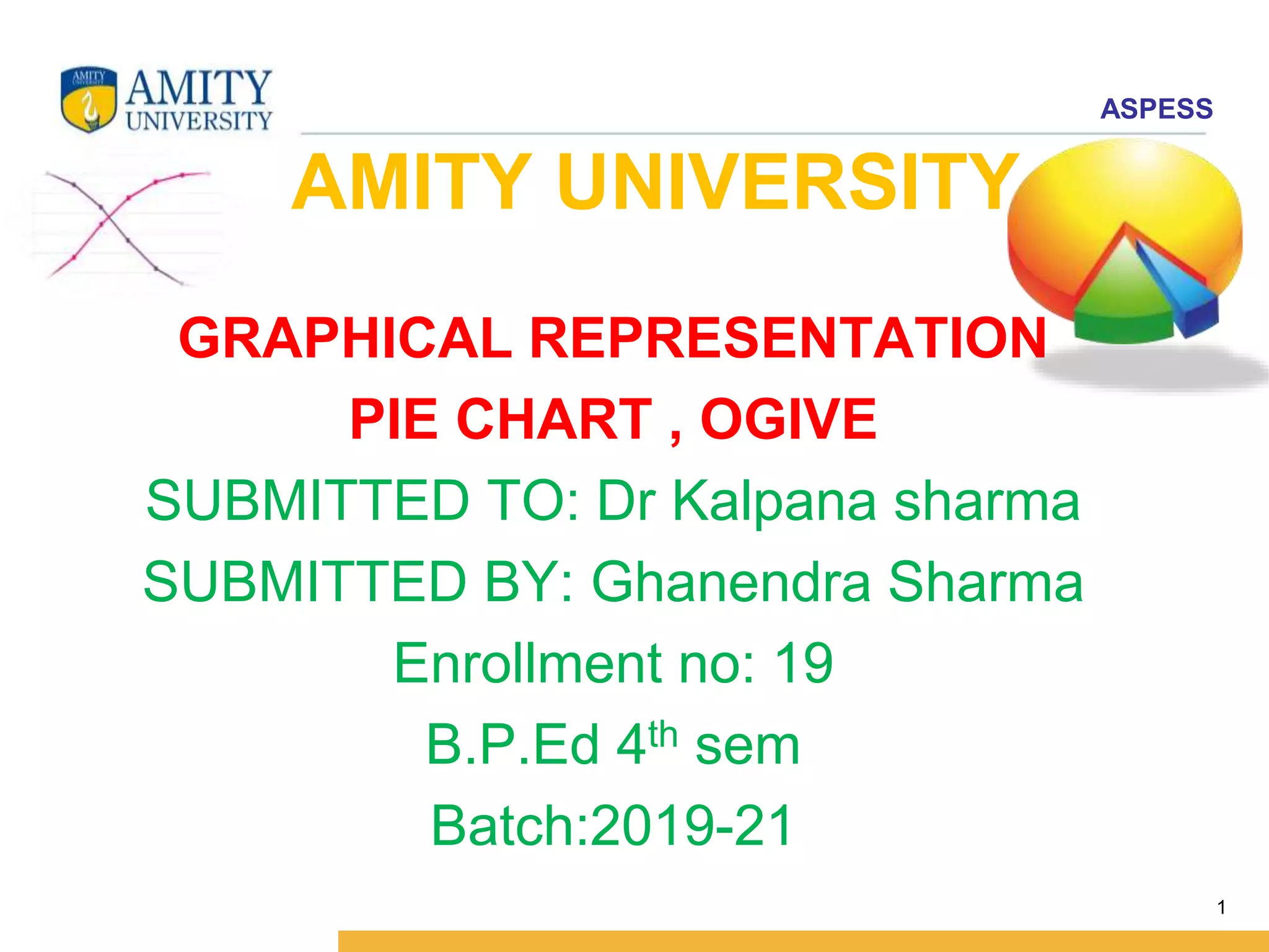 1. The document discusses pie charts and ogives, which are graphical representations used to illustrate numerical proportions and cumulative frequencies in data sets.