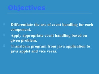 The document discusses different types of events and event handling in Java graphical user interfaces (GUIs). It describes how events are generated by user actions and how listener objects register to handle specific events. It provides examples of using event listeners and handlers for common events like button clicks, list selections, and text field entries. Key points covered include the delegation model for event handling in Java and examples of implementing listeners for actions, items, selections and other events.