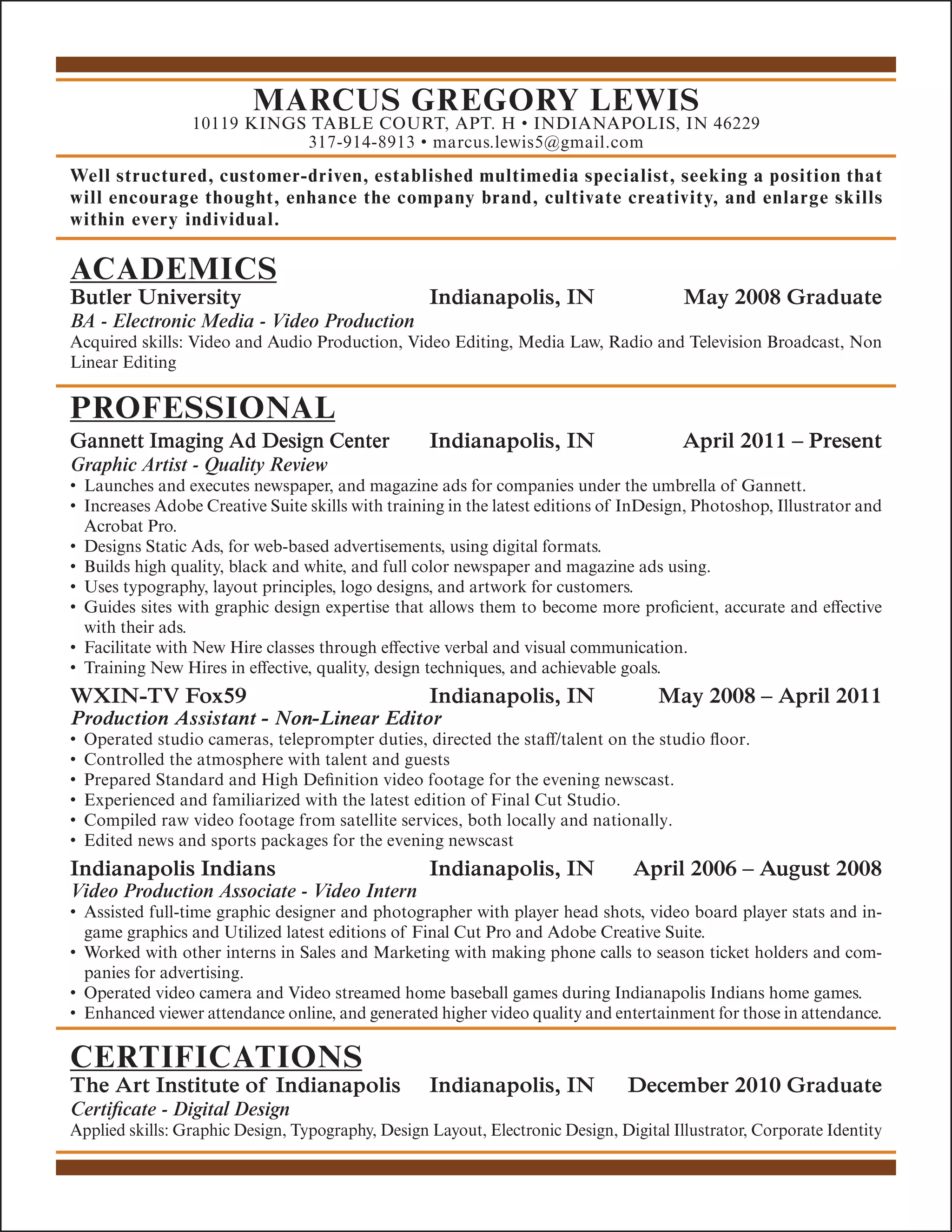 Marcus Gregory Lewis is a well-structured multimedia specialist seeking a position that encourages thought and enhances brands. He has a certificate in digital design from The Art Institute of Indianapolis and a BA in electronic media from Butler University. His professional experience includes working as a graphic artist at Gannett Imaging where he designs ads, as a production assistant and non-linear editor at WXIN-TV Fox59 where he edited video packages, and as a video production associate and intern for the Indianapolis Indians where he operated cameras and streamed games.