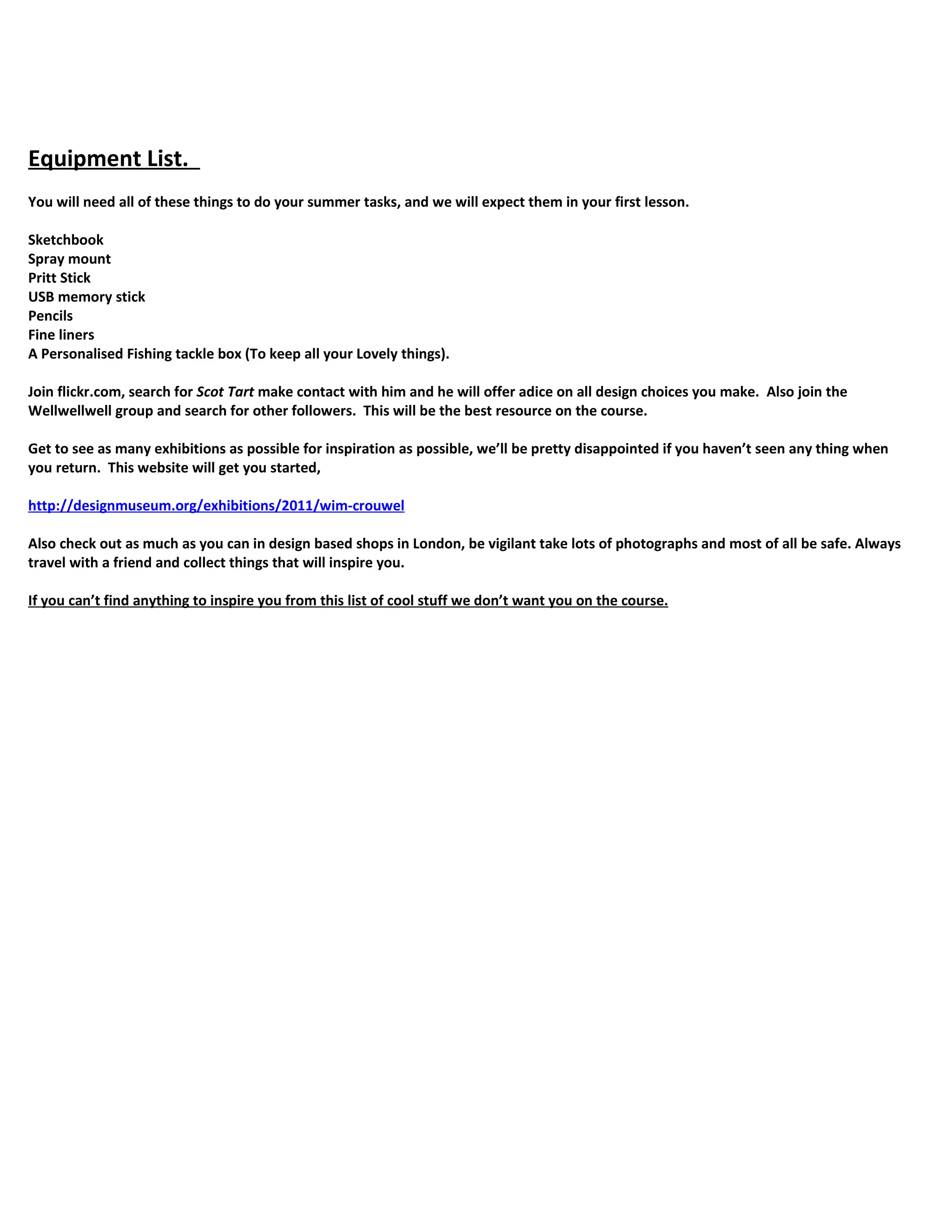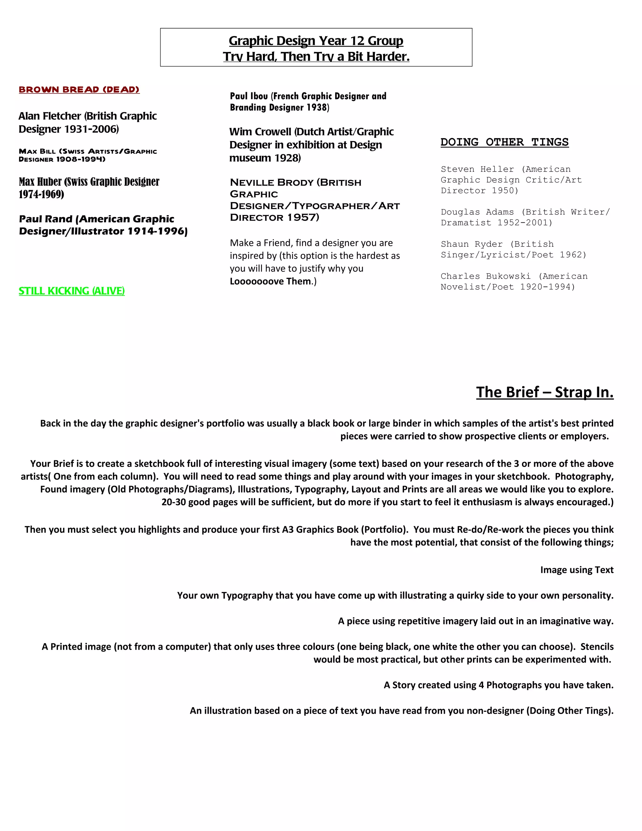 The document provides instructions for a graphic design student group project to create a sketchbook and portfolio. Students are asked to research and explore visual imagery, text, typography, layout, prints, and photography based on 3 graphic designers from different eras. They must then select highlights to produce an A3 graphic design portfolio, including original typography, repetitive imagery, 3-color prints, a story using photos, and an illustration based on non-design text. Students are provided an equipment list and encouraged to visit exhibitions and design shops for inspiration and to join online design communities.