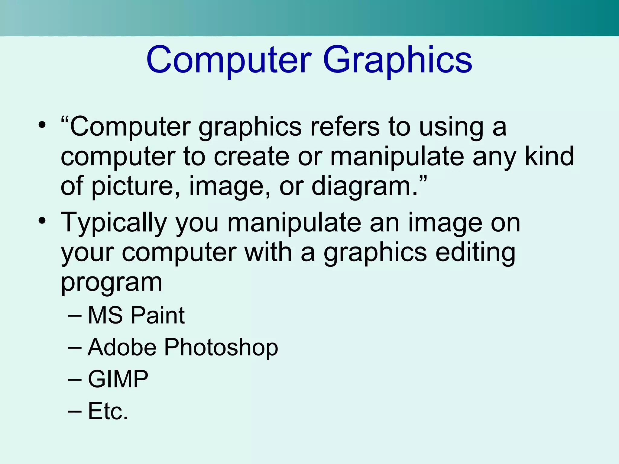 This document provides an overview of computer graphics and image file formats. It discusses the two main types of graphics - bitmapped (raster) and vector graphics. Bitmapped graphics store images as grids of pixels while vector graphics use shapes and paths. Common file formats for each type are also outlined, including JPEG, GIF and PNG for bitmapped images and SVG for vector images. Factors for choosing a file format like image type, portability and transparency support are highlighted. Concepts like color depth, compression, dithering and alpha channels are also summarized.