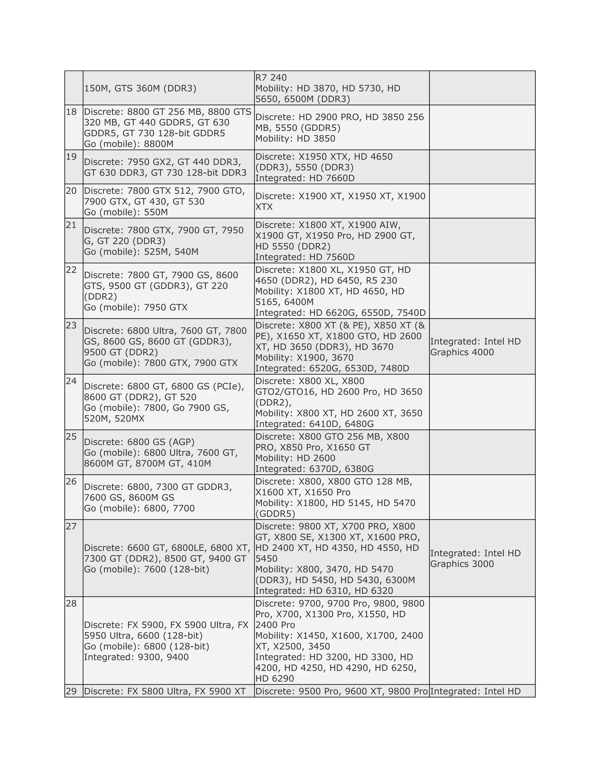 3. Lower performing cards encompass many GeForce and Radeon models down to integrated graphics solutions from Intel.