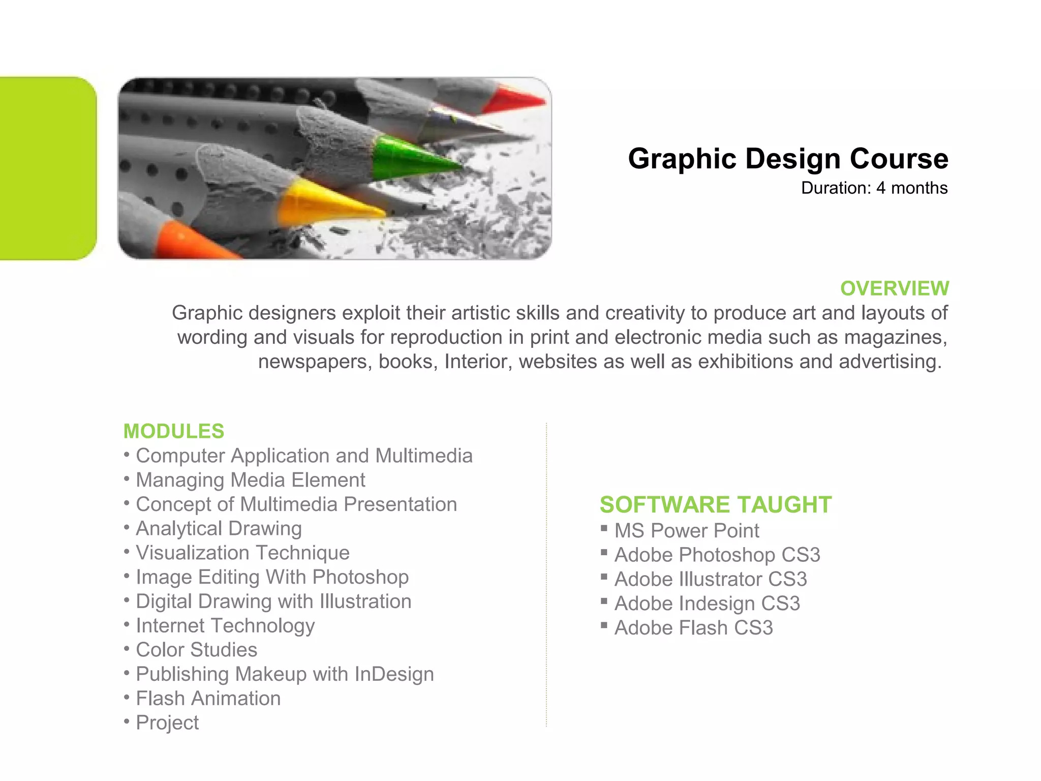The graphic design course is 4 months long and covers a variety of modules including computer applications, multimedia presentations, drawing, image editing with Photoshop, digital drawing with Illustrator, and publishing with InDesign. Students will learn software like Photoshop, Illustrator, InDesign, PowerPoint, and Flash. The course aims to teach students how to use their artistic skills and creativity to produce visual designs for various media like magazines, websites, and advertising.