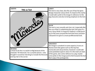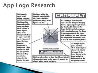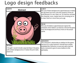 The document discusses logo design principles and the process of designing a logo for a pig-themed mobile game. Some key points covered include: