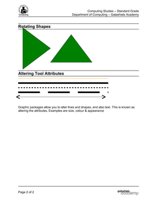 This document discusses graphics tools and features in computing packages, including different selection and drawing tools, methods for saving files in various formats like JPEG and PNG that compress file sizes, rotating and modifying attributes of shapes and lines like size, color, and appearance. It also mentions altering text attributes. The document provides information over two pages on graphics editing capabilities in standard computing studies.