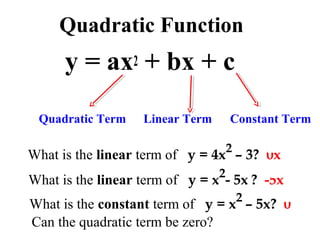 This document provides information about graphing quadratic functions. It defines the standard form of a quadratic function as y = ax^2 + bx + c and explains that the sign of a determines if the parabola opens up or down. It describes how to find the axis of symmetry, vertex, domain and range. The steps to graph a quadratic function are given as finding the axis of symmetry, the vertex, and then two other points to reflect across the axis and connect with a smooth curve. Methods for finding the axis of symmetry, vertex, y-intercept and solutions are demonstrated through examples.
